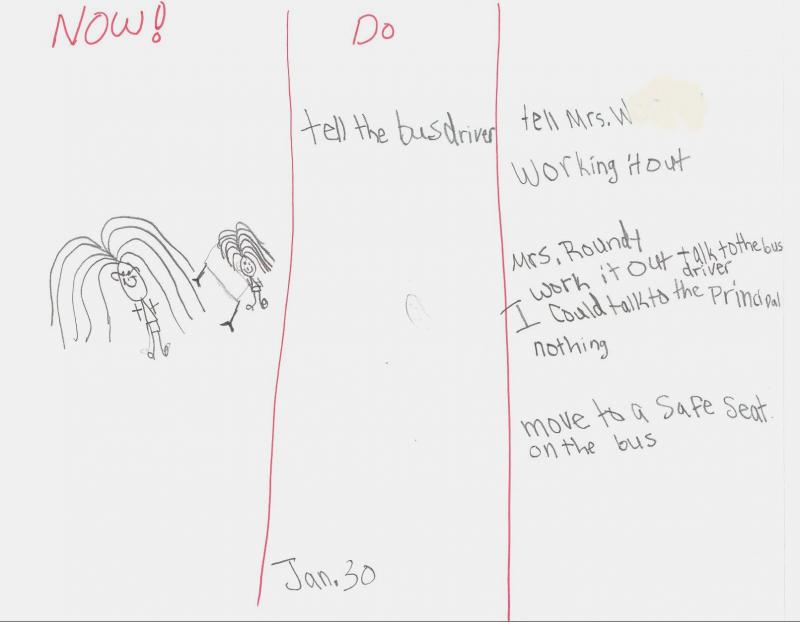 Dawn and I discussed what the problem is from her perspective. I think it is important to take things from her perspective using the presupposition that the “map is not the territory.” We then went to the third block and discussed several options. I told her to be creative and come up with all of the ideas she could. She did, and we then filtered them and wrote out which ones were safe to do. She could entertain the idea of bopping the girl on the head, but she couldn’t actually do it. Sometimes children with special needs take things literally when other children understand and reject them as fun but not to be taken seriously. I have written down such options for normal kids, but special ed kids often cannot filter fantasy from reality. I had to make an accommodation for her disability.